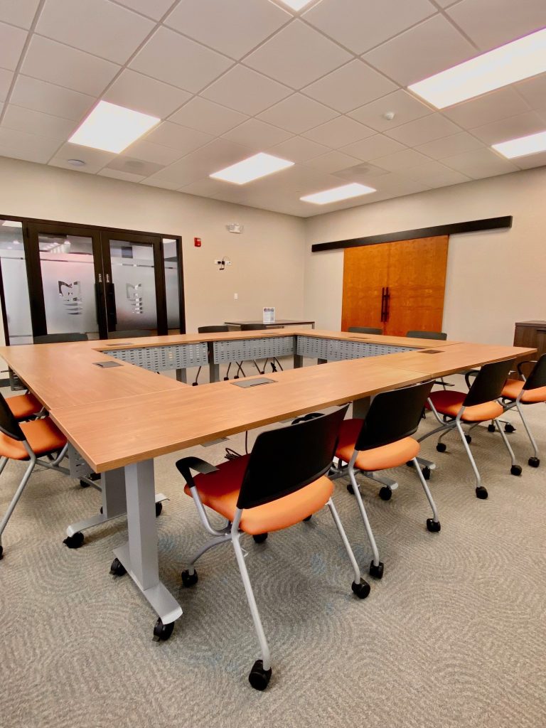 Lucy provided an image of her in-house meeting room for their small study groups. The tables can be moved to support a conference style setup (rectangle) or classroom style set up.